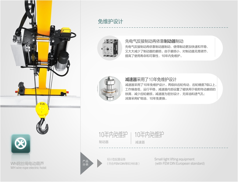 節(jié)能環(huán) 保等優(yōu)勢(shì)。電動(dòng)葫蘆應(yīng)用8項(xiàng)專利技術(shù),零部件采用模塊化制造工藝,通用性強(qiáng),免維護(hù)率高,易損件少。