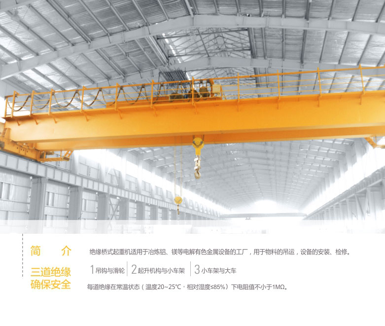 1、 QY型絕緣吊鉤橋式起重機(jī)適用于有色金屬電解鋁、鎂、鉛、鋅等冶煉車間。